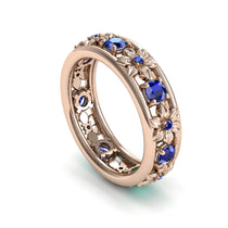 Are you searching for a ring to give her that will last her forever? This beautiful Anniversary ring is our Victoria Sapphire ring. Set in 14K Rose Gold, this beautiful ring has flowers and a vintage feel that will always be in style. Set with Sapphire and Black Diamond, this ring is a gift that she will treasure forever.