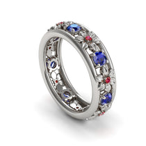 Are you searching for a ring to give her that will last her forever? This beautiful Anniversary ring is our Victoria Sapphire ring. Set in 14K White Gold, this beautiful ring has flowers and a vintage feel that will always be in style. Set with Sapphire and Black Diamond, this ring is a gift that she will treasure forever.