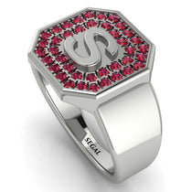 Leaving your personal signature has never been more stylish than with this Personalized Signature Ruby Ring. This Personalized Signature Ruby Ring is a circular band with a wider flat top, on which is the personalized letter signature and two rows of round diamonds surrounding it. Having both style and grace, this Personalized Signature Ruby Ring is for you.