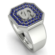Leaving your personal signature has never been more stylish than with this Personalized Signature Sapphire Ring. This Personalized Signature Sapphire Ring is a circular band with a wider flat top, on which is the personalized letter signature and two rows of round diamonds surrounding it. Having both style and grace, this Personalized Signature Sapphire Ring is for you.