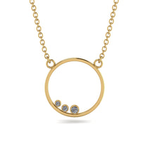 Modern and geometric, this open circle necklace celebrates family. Crafted gold, this sparkling design features three diamond in the open circle that lights up your casual and dressy looks. With no beginning and no end, this shimmering diamond circle pendant is a symbol of your everlasting love