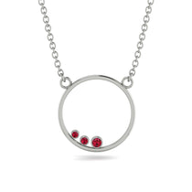 Modern and geometric, this open circle necklace celebrates family. Crafted gold, this sparkling design features three Ruby in the open circle that lights up your casual and dressy looks. With no beginning and no end, this shimmering Ruby circle pendant is a symbol of your everlasting love