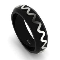 Stunning black wedding band with golden waved line crossing along the black titanium base of the ring. Beautiful and memorable design that will win his heart at first sight.