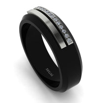 Wedding band that will make him impressed. Beautiful and stylish black titanium ring decorated with two golden lines and set of 13 top-notch diamonds. A unique gift that he will love to wear every day of his life.