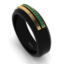 Wedding band that will make him impressed. Beautiful and stylish black titanium ring decorated with two golden lines and set of 13 top-notch Emeralds. A unique gift that he will love to wear every day of his life.