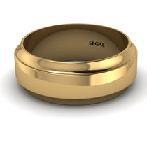 Stylish and masculine, this vintage-style wedding band appeals to his sophisticated taste. Fashioned in gold, this 7.0mm-wide design features polished beveled edges add further visual interest to the look. Buffed to a brilliant luster, this comfort-fit wedding band was designed with your love for him in mind.