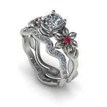 Platinum 1ct Cushion-cut lab created diamond. Unique Floral Engagement Ring - Modeled after a romantic and fashionable eternity band, this ring is designed with a curvy silhouette and leaves on both sides for the look of a bonded twist, a symbol that represents a fervent, timeless love. A mega-watt stone and small jewels positioned as the ’flowers’ pistils turn out an incredible design that’s femme, stylish and sleek—fit for any lucky bride.