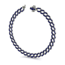 Big and bold, this beautifully crafted Miami Cuban Link chain is featured in solid Gold. The links are detailed with pave set brilliant small round cut Sapphire. This luxurious necklace is wide and great to wear by itself or with your favorite charm. This vibrant chain has a secure locking with a durable large box clasp holding the necklace.