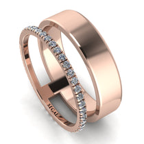 Complex and elegant, this Golden Ration diamond Band consists of two conjoined round bands, a wider and narrower one, and will look amazing on your finger. The narrower band also has a band of round diamonds covering it, making this Golden Ration diamond Band even more beautiful. With its intricate and graceful design, you’ll love this Golden Ration diamond Band.