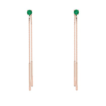 Super slim and super stylish, these thread earrings are a fun look for the girl on the go. Fashioned in gold, these alluring earrings feature a single, shimmering Emerald at the top. The post earrings and fine chain are threaded through the ear easily. Polished to a brilliant shine.