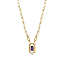 A contemporary look that pairs well with most anything, this subtle Sapphire pendant is sure to become her favorite go-to accessory. Appeal to her modern taste with this alluring pendant, featuring an elongated hexagon frame with 0.06ct oval shaped Sapphire in the center that enhances the classic. Buffed to a brilliant luster and sure to be instantly treasured, this meaningful pendant suspends along an 18.0-inch link chain that secures with a spring-ring clasp.