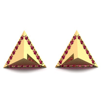 Take your look up a notch with these sleek Ruby stud earrings. Fashioned in warm gold, each triangular stud shimmers with a 3-way border by pavé-set bright white Ruby. White Ruby line the edges of each design, ensuring sparkle and shine from every angle. Beautifully finished and ready to wear, these glistening earrings are secured comfortably with friction back
