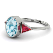 Timeless and graceful, this Geometrical Bezel Aquamarine Ring is just what you need for a special occasion. This Geometrical Bezel Aquamarine Ring consists of a comfortable band and an Oval central Aquamarine, with two second triangle stones next to it. With this stunning Geometrical Bezel Aquamarine Ring you’ll want to wear forever