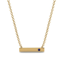 This gold horizontal bar necklace is a trendsetting accessory she is sure to adore. One stunning Sapphire is bezel set within this gold bar to add just the right amount of bling. With approximately 0.15 carats of Sapphire glam, this sideways bar necklace makes it the perfect gift for the woman who appreciates fashion with ease.