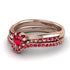 This delicate Ruby bridal set is a timeless classic of jewelry reinvented in modern forms. This set is a classic round 0.25-carat Ruby engagement ring with an additional stone in a center and on the ring's sides and a gorgeous thin wedding ring as a stunning complement to the main ring. The special mechanism will not let the two rings separate while they are put on the finger and can be separated only when the set is taken off.