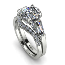 Find that gorgeous and everlasting ring made just for you with this Glamorous Custom diamond Bridal Set. This bridal set has a round center stone with a custom baguette stone to either side of it. The wedding ring adds additional line of gemstones to the bridal set. If you want a piece of jewelry that will be special and personal to you, you got it with this Glamorous Custom diamond Bridal Set.