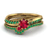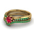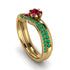 This delicate Ruby bridal set is a timeless classic of jewelry reinvented in modern forms. This set is a classic round 0.25-carat Ruby engagement ring with an additional stone in a center and on the ring's sides and a gorgeous thin wedding ring as a stunning complement to the main ring. The special mechanism will not let the two rings separate while they are put on the finger and can be separated only when the set is taken off.