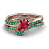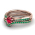 This delicate Ruby bridal set is a timeless classic of jewelry reinvented in modern forms. This set is a classic round 0.25-carat Ruby engagement ring with an additional stone in a center and on the ring's sides and a gorgeous thin wedding ring as a stunning complement to the main ring. The special mechanism will not let the two rings separate while they are put on the finger and can be separated only when the set is taken off.