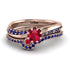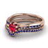 This delicate Ruby bridal set is a timeless classic of jewelry reinvented in modern forms. This set is a classic round 0.25-carat Ruby engagement ring with an additional stone in a center and on the ring's sides and a gorgeous thin wedding ring as a stunning complement to the main ring. The special mechanism will not let the two rings separate while they are put on the finger and can be separated only when the set is taken off.
