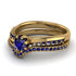 This delicate Sapphire bridal set is a timeless classic of jewelry reinvented in modern forms. This set is a classic round 0.25-carat Sapphire engagement ring with an additional stone in a center and on the ring's sides and a gorgeous thin wedding ring as a stunning complement to the main ring. The special mechanism will not let the two rings separate while they are put on the finger and can be separated only when the set is taken off.