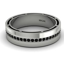 Mark your special day in style with this black diamond wedding band for him. Crafted in polished and satin-finished gold, this wide band shimmers with black diamond in a channel along the center of the satin-finished stripe. Polished grooves and outer borders flank the design. Custom-made to fit his ring size.