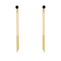Super slim and super stylish, these thread earrings are a fun look for the girl on the go. Fashioned in gold, these alluring earrings feature a single, shimmering black diamond at the top. The post earrings and fine chain are threaded through the ear easily. Polished to a brilliant shine.