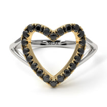 When you desire to be original and modern, you want this Split Shank Heart black diamond Ring on your finger. This Split Shank Heart black diamond Ring has a band that splits into two before reaching the heart shape on top. Furthermore, this heart shaped is set with twenty two black diamonds. When you want to stand out and be noticeable, this Split Shank Heart black diamond Ring is for you.