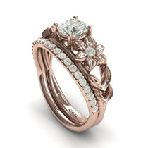 Rose Gold 0.84 Carat Round Cut Diamond Unique Leaf Engagement Ring - Luminous stones and exquisite precious metal flowers and leaves make this ring the perfect expression of love. A pop of color, dimensional flowers and high-quality jewels are markers of our in-depth design process and expert craftsmanship that makes this piece every girl’s fantasy. Named Ella after our favorite fictional princess—this ring is the perfect start to a fairytale marriage and a very happy ending.