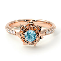 My ‘Elena’ Rose Aquamarine ring brings the beauty of Flowers Aquamarine and Diamonds together in one exquisite and comfortable ring. Nestled in the center of the flower is a single Natural Aquamarine, flanked on either side by 5 smaller natural diamonds. Set in solid 14K Rose gold, this vintage antique engagement ring is sure to make her throw her arms around you, give you a huge kiss and say yes!