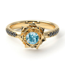 My ‘Elena’ Rose Aquamarine ring brings the beauty of Flowers Aquamarine and Black Diamonds together in one exquisite and comfortable ring. Nestled in the center of the flower is a single Natural Aquamarine, flanked on either side by 5 smaller natural black diamonds. Set in solid 14K Yellow gold, this vintage antique engagement ring is sure to make her throw her arms around you, give you a huge kiss and say yes!