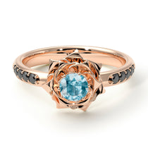 My ‘Elena’ Rose Aquamarine ring brings the beauty of Flowers Aquamarine and Black Diamonds together in one exquisite and comfortable ring. Nestled in the center of the flower is a single Natural Aquamarine, flanked on either side by 5 smaller natural black diamonds. Set in solid 14K Rose gold, this vintage antique engagement ring is sure to make her throw her arms around you, give you a huge kiss and say yes!