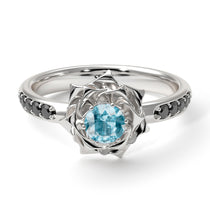 My ‘Elena’ Rose Aquamarine ring brings the beauty of Flowers Aquamarine and Black Diamonds together in one exquisite and comfortable ring. Nestled in the center of the flower is a single Natural Aquamarine, flanked on either side by 5 smaller natural black diamonds. Set in solid 14K White gold, this vintage antique engagement ring is sure to make her throw her arms around you, give you a huge kiss and say yes!