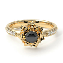 My ‘Elena’ rose black diamond rings brings the beauty of flowers and diamonds together in one exquisite and comfortable ring. Nestled in the center of the flower is a single Natural Black Diamond, flanked on either side by 5 smaller natural diamonds. Set in solid 14K Rose gold, this vintage antique engagement ring is sure to make her throw her arms around you, give you a huge kiss and say yes!