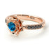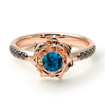 My ‘Elena’ Rose Blue Topaz ring brings the beauty of Flowers Blue Topaz and Black Diamonds together in one exquisite and comfortable ring. Nestled in the center of the flower is a single Natural Blue Topaz, flanked on either side by 5 smaller natural black diamonds. Set in solid 14K Rose gold, this vintage antique engagement ring is sure to make her throw her arms around you, give you a huge kiss and say yes!