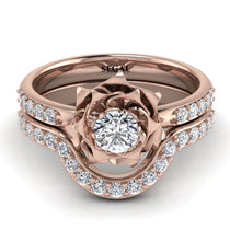 My ‘Elena’ Rose diamond ring brings the beauty of Flowers and Diamonds together in one exquisite and comfortable ring. Nestled in the center of the flower is a single Natural Black Diamond, flanked on either side by 5 smaller natural diamonds. With a matching band that nested on the engagement ring. Set in solid 14K Red gold, this vintage antique engagement ring is sure to make her throw her arms around you, give you a huge kiss and say yes!