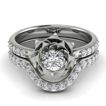 My ‘Elena’ Rose diamond ring brings the beauty of Flowers and Diamonds together in one exquisite and comfortable ring. Nestled in the center of the flower is a single Natural Diamond, flanked on either side by 5 smaller natural diamonds. With a matching band that nested on the engagement ring. Set in solid 14K White gold, this vintage antique engagement ring is sure to make her throw her arms around you, give you a huge kiss and say yes!