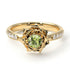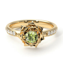 My ‘Elena’ Rose Peridot ring brings the beauty of Flowers Peridot and Diamonds together in one exquisite and comfortable ring. Nestled in the center of the flower is a single Natural Peridot, flanked on either side by 5 smaller natural diamonds. Set in solid 14K Yellow gold, this vintage antique engagement ring is sure to make her throw her arms around you, give you a huge kiss and say yes!