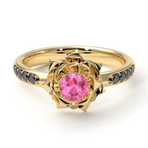 My ‘Elena’ Rose Pink Moissanite ring brings the beauty of Flowers Pink Moissanite and Black Diamonds together in one exquisite and comfortable ring. Nestled in the center of the flower is a single Natural Pink Moissanite, flanked on either side by 5 smaller natural black diamonds. Set in solid 14K Yellow gold, this vintage antique engagement ring is sure to make her throw her arms around you, give you a huge kiss and say yes!