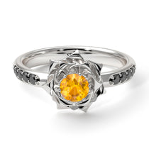 My ‘Elena’ Rose Yellow Diamond ring brings the beauty of Flowers Yellow Diamond and Black Diamonds together in one exquisite and comfortable ring. Nestled in the center of the flower is a single Natural Yellow Diamond, flanked on either side by 5 smaller natural black diamonds. Set in solid 14K White gold, this vintage antique engagement ring is sure to make her throw her arms around you, give you a huge kiss and say yes!