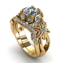 Yellow Gold 0.84 Carat Round Cut Diamond Art Deco Flower Engagement Ring - An engagement marks the beginning. Plant the seed for your love to grow lusher with this unqiue ornate botanical ring. There are 101 good things to say about a man who gives flowers, but there are a million and one to say about a man who gifts an eternal bouquet of flowers that shines from every angle. A wreath of pointed-petal blossoms and stones surround the scintillating central stone. The design continues with a matching flower on each side and captivating band cutouts.