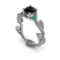 White Gold 0.84 Carat Round Cut Black Diamond Designer Leaf Engagement Ring - If she loves Mother Nature, she's going to love our 'Allison' Leaf engagement ring. This Unique Engagement Ring is set in sparkling solid Gold and decorated with Leaves and Branches to create a beautiful unique ring. Set with a large 6mm center stone and smaller side stones, the result is a perfect engagement ring to make her say yes.