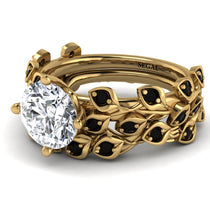One of our favorite statement bridal sets, this exquisite design features 17 scintillating stones and story-telling enchantments. Sprouting jewel-set leaves climbing both sides of a slender band and a brilliant-cut stone, this treasured piece was modeled off Grecian laurel wreaths. Our decadent take on the historic prize makes it a dream-come-true ring that always catches someone's impressed eye.