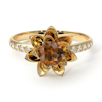Yellow Gold 0.5 Carat Round Cut Brown Diamond Pave Flower Engagement Ring - Her name is simply... 'Lotus'. This Beautiful unique Gold Lotus flower engagement ring is one of my personal favorites and best creations. The Lotus flower is considered by many cultures to be a symbol of Rebirth, Purity and exquisite unparalleled beauty. There is no doubt this ring is the perfect match for those special and unique women out there.