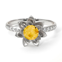 White Gold 0.5 Carat Round Cut Citrine Pave Flower Engagement Ring - Her name is simply... 'Lotus'. This Beautiful unique Gold Lotus flower engagement ring is one of my personal favorites and best creations. The Lotus flower is considered by many cultures to be a symbol of Rebirth, Purity and exquisite unparalleled beauty. There is no doubt this ring is the perfect match for those special and unique women out there.