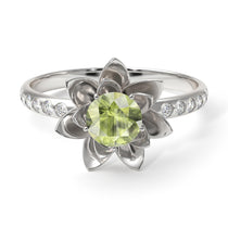 White Gold 0.5 Carat Round Cut Peridot Pave Flower Engagement Ring - Her name is simply... 'Lotus'. This Beautiful unique Gold Lotus flower engagement ring is one of my personal favorites and best creations. The Lotus flower is considered by many cultures to be a symbol of Rebirth, Purity and exquisite unparalleled beauty. There is no doubt this ring is the perfect match for those special and unique women out there.