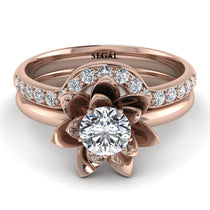 Rose Gold 1 Carat Round Cut Diamond Pave Lotus Bridal set- Her name is simply... 'Lotus'. This Beautiful unique Gold Lotus flower engagement ring is one of my personal favorites and best creations. The Lotus flower is considered by many cultures to be a symbol of Rebirth, Purity and exquisite unparalleled beauty. There is no doubt this ring is the perfect match for those special and unique women out there.