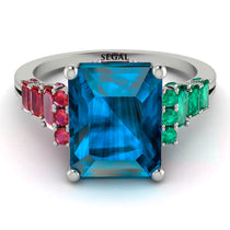 With this Emerald Cut Blue Topaz Ring Hidden Round Diamonds you can be confident and self-assured, as you’ll look stunning. This Emerald Cut Blue Topaz Ring Hidden Round Diamonds has an emerald center stone and three round and three princess stones to either of its sides, with which you can be sure you won’t just be a part of the crowd.
