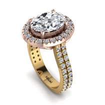 This Gorgeous Oval Cut diamond Pave Double Shank Engagement Ring with Hidden Stone is a uniquely fresh approach to classic Double Shank Engagement Rings. Beautiful oval cut 2ct center stone with a sparkling halo of stones around, elegant pave of stones and dazzling surprise stone inside the ring will make her fall in love with this set at first sight.