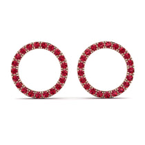 Regardless of whether you want something classic and timeless, or you desire to grace your collection with something fresh and new, these Circle Stud Ruby Earrings are for you. These Circle Stud Ruby Earrings are circular in shape and are completely covered in round Rubys. When you want something that is perfect, this Circle Stud Ruby Earrings will exceed your expectations.