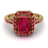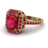 The Emerald Cut Ruby Vintage-Inspired Engagement Ring is a striking blend of timeless elegance and intricate craftsmanship. The focal point of this exquisite ring is a dazzling emerald-cut Ruby, renowned for its long, sleek lines and mirror-like facets that create a captivating hall of mirrors effect. This cut highlights the Ruby's clarity and lends a sophisticated air to the overall design.Encircling the central emerald-cut Ruby is a halo of smaller round Rubys, meticulously set to enhance the ring's brilliance and add a touch of vintage glamour. These accent Rubys amplify the sparkle and create a stunning contrast against the clean lines of the emerald cut.The band, crafted from luxurious 14K gold, features a delicate pave setting of round Rubys that extends halfway down the shank. This intricate detailing adds to the ring's vintage charm and ensures it sparkles from every angle. The gold band is polished to a high sheen, providing a warm, rich backdrop that beautifully complements the bright gems.The gallery and undercarriage of the ring showcase intricate filigree work, a nod to antique jewelry design. This handcrafted detail adds depth and character, making the ring a true piece of art. Combining the emerald cut's modern elegance with the vintage-inspired setting creates a unique and timeless piece that is both classic and contemporary.The Emerald Cut Ruby Vintage-Inspired Engagement Ring is perfect for those who appreciate the beauty of both past and present. Its sophisticated design and meticulous craftsmanship make it a stunning symbol of enduring love and commitment. This ring is an ideal choice for celebrating a significant milestone and promises to be cherished for generations to come.